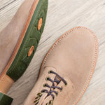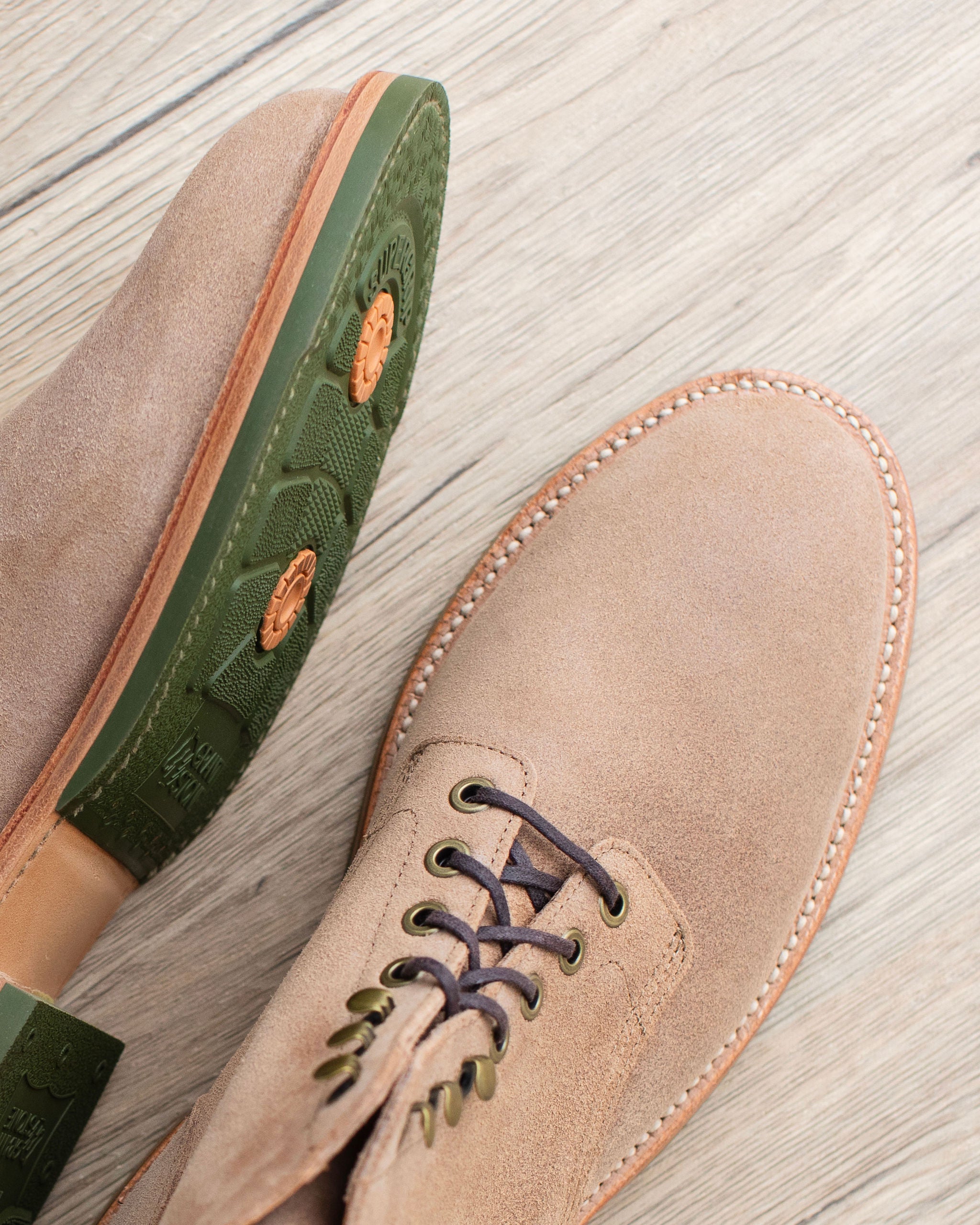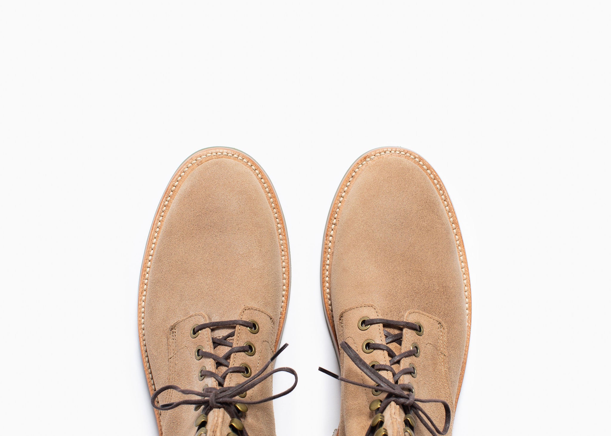 This Halloween’s Chromexcel leather is named after the Marine's N-1 Field Shoe, commonly called the 'Boondocker.’ This full-grain leather is used flesh-side out, providing a roughout texture with a fine, even nap. The 'Marine Field Shoe' leather will develop an aggressive patina; its light tan nap will mat down and significantly darken over time, transforming into a rich, deep golden brown.