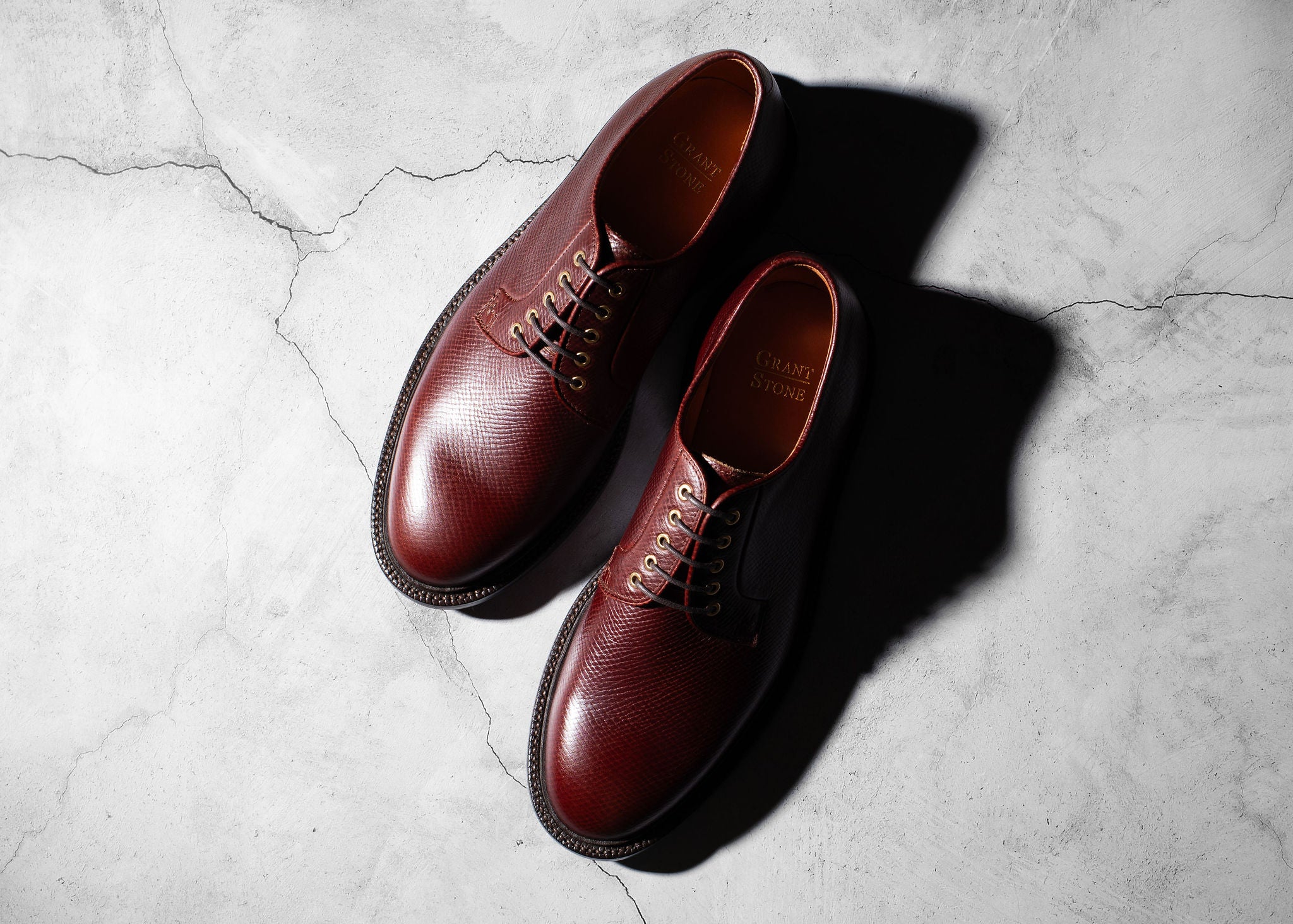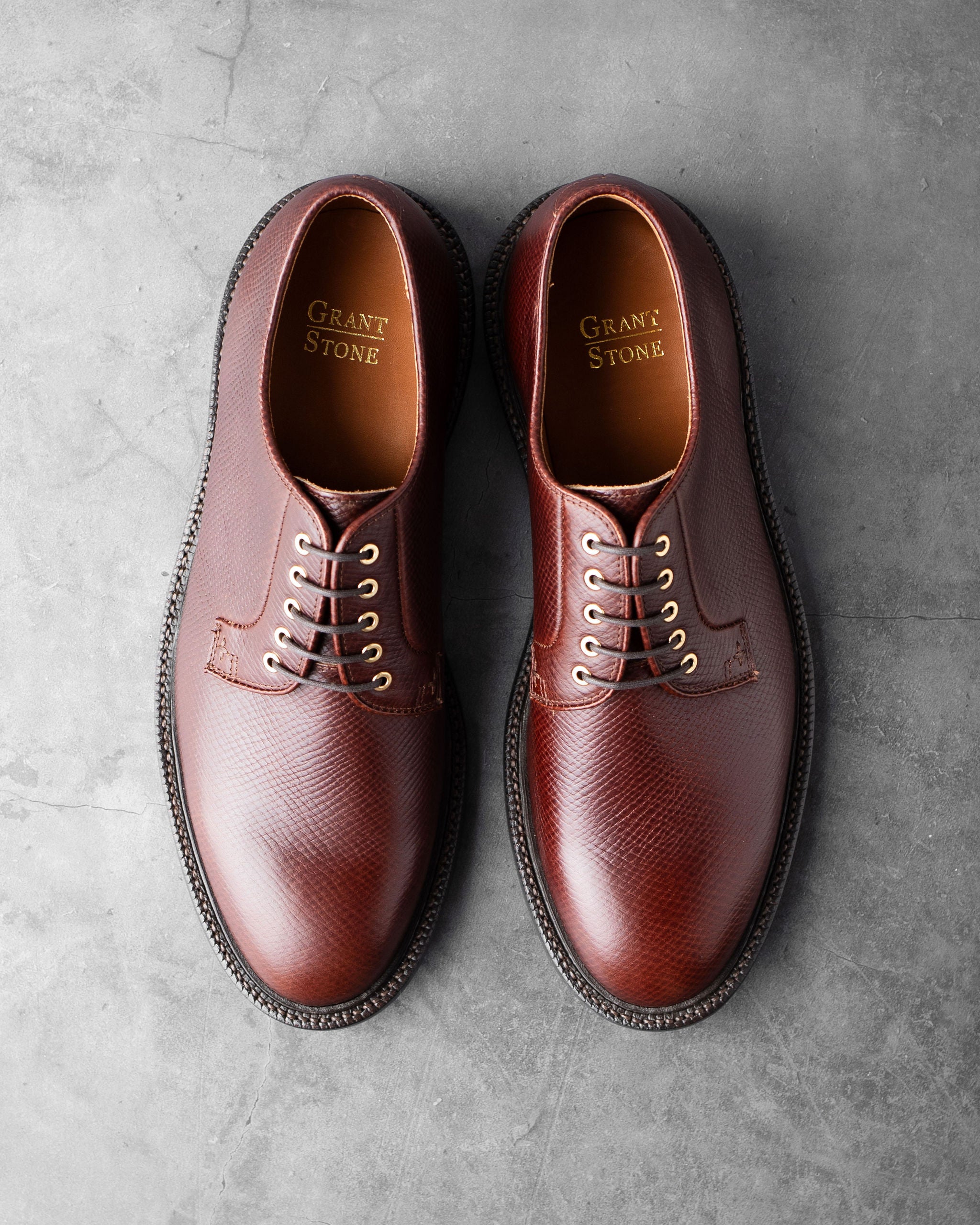 Horween’s Pioneer Reindeer is their recreation of the famous “Russian Reindeer” leather, discovered in the 18th-century Metta Catharina shipwreck. The leather shares many characteristics with Horween’s Chromexcel: aniline-dyed, heavy pull-up, and combination-tanned. It is distinguished by a heavy embossment, creating a strictly defined, diamond-shaped hatch grain pattern.
