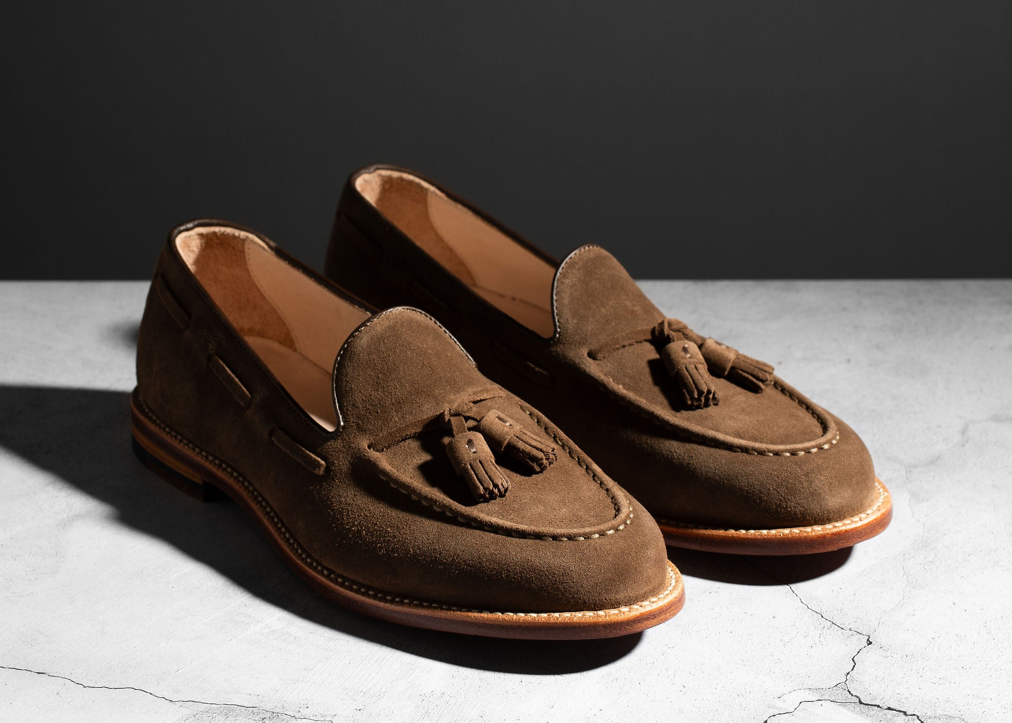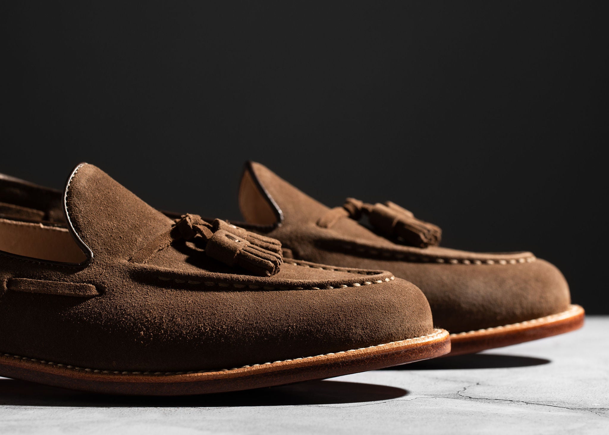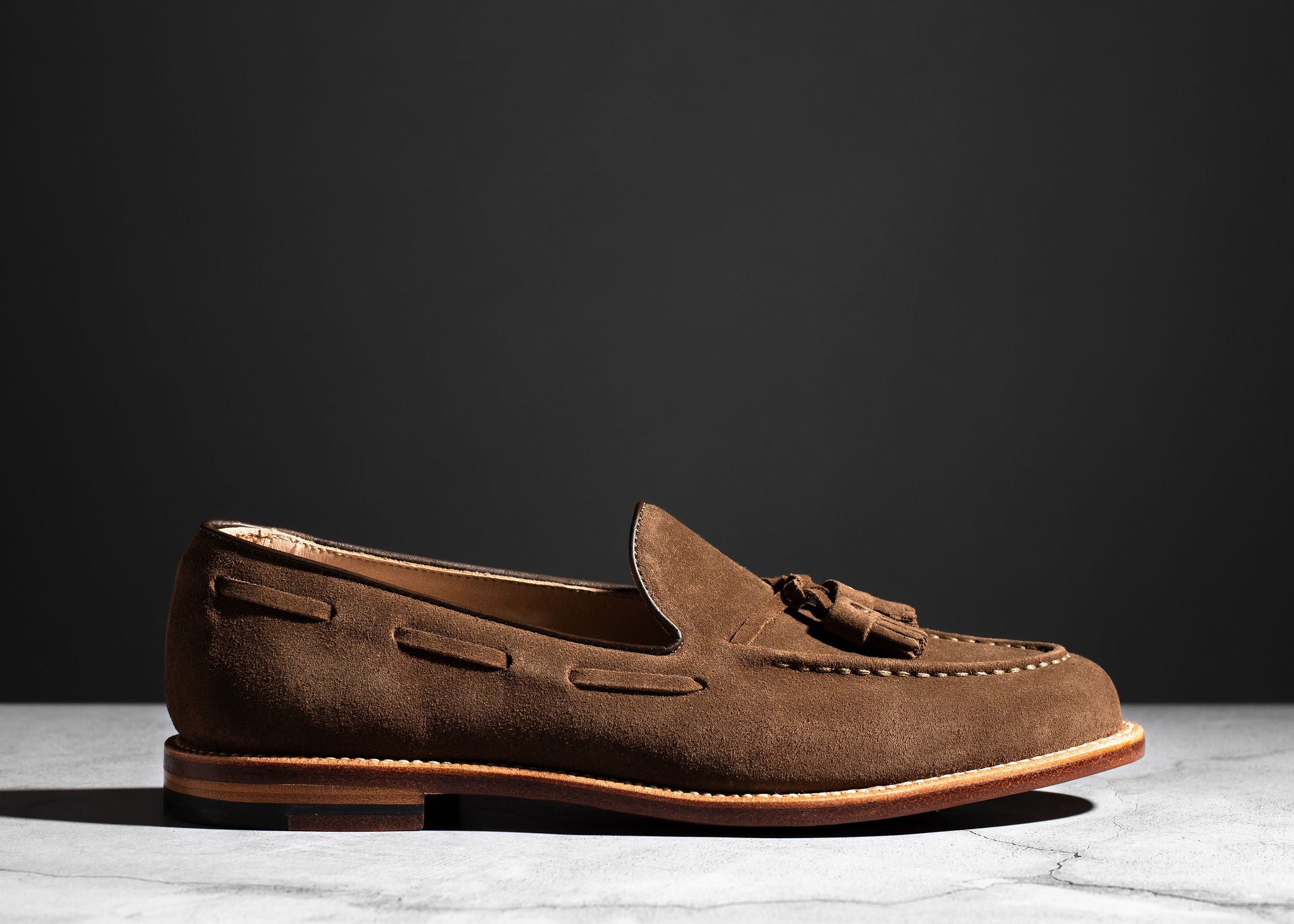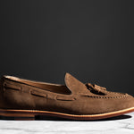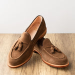 Crafted from Charles F. Stead's water-resistant Safari Repello calf suede, these Husk Suede Tassel Loafers offer a sophisticated yet relaxed aesthetic. The classic tassel loafer design is enhanced by the soft, luxurious suede and distinctive tassels, creating a refined look perfect for both casual and elevated ensembles. Combining effortless slip-on style with durable construction, these loafers are a versatile and elegant choice for any discerning individual, providing comfort and timeless appeal for any adventure.